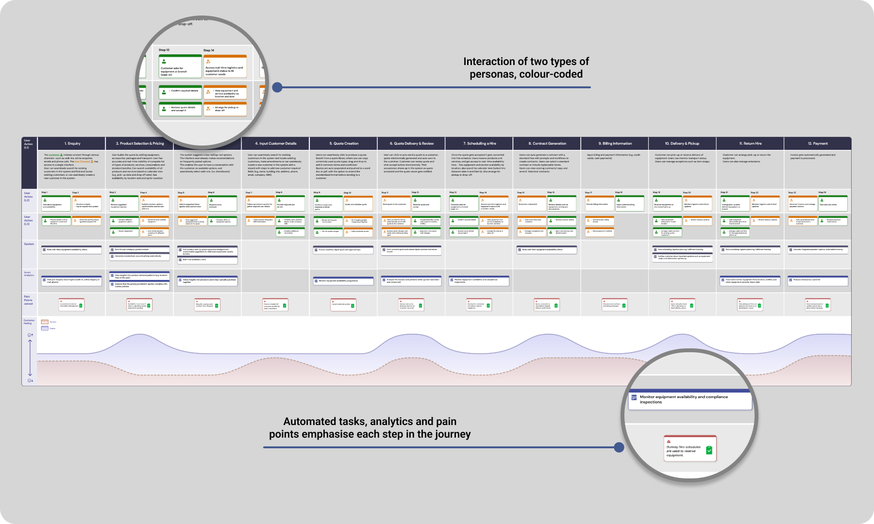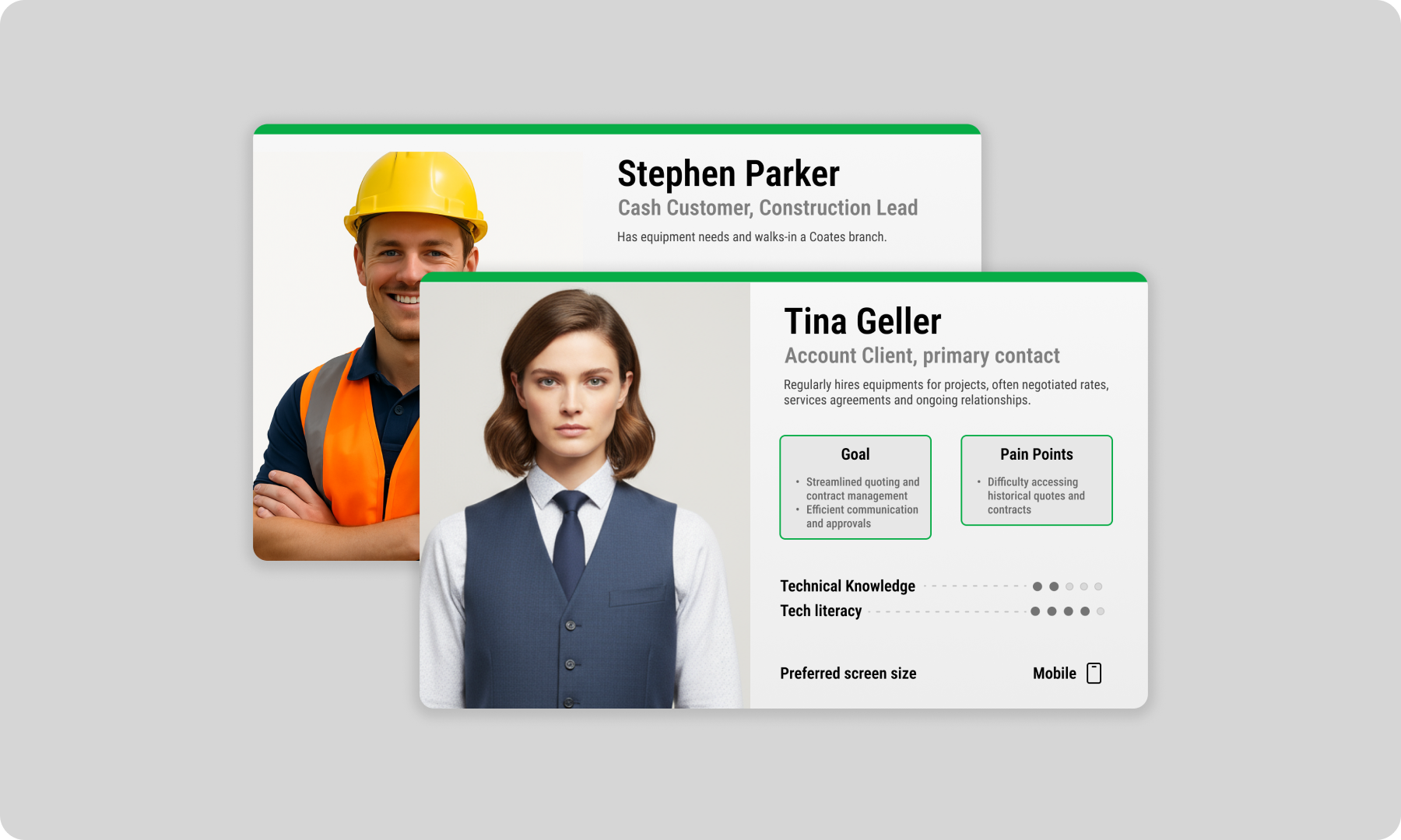 Classifying the user personas into two groups was chosen to be the best practice. All the UX of their productivity tool is supposed to be based on two types of users interacting: Coates employee and Coates customers. Employees would be the actual tool users, the ones who help customers with their equipment needs. Customer personas were added due to their specific pain points and demands: the most critical KPIs for the business.