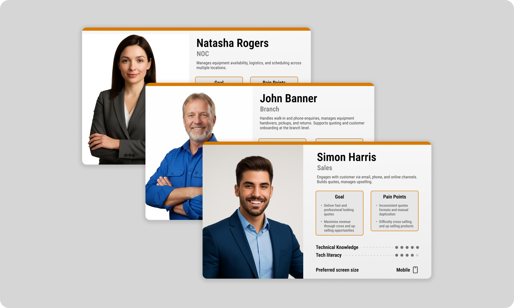 In order to better understand the user, we conducted user interviews and shadowed Coates Hire employees. It was very clear that the business was in need for having specific user personas, based on the teams that most use the application and their specific demands and desires.
